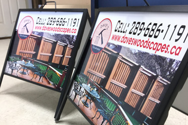 Commonly used at open public events, or outside of retail and commercial businesses, A-frame signs display essential advertising of products and services which draws in customers. Restaurants, realtors, festival organizers, retail stores, salons and many other companies in and around Hamilton rely on Premier Printing & Signs Ltd. for our beautifully crafted A-frame signs. Suitable for any occasion, from open-houses, grand-openings, sales, promotions etc., or simply to attract new clientele, our A-frame signs are constructed from durable and lightweight metal frames and "coroplast" panels and will endure harsh elements like rain, snow and prolonged sun exposure. We incorporate aesthetically pleasing backdrops, colours and designs into every A-frame sign that we manufacture.